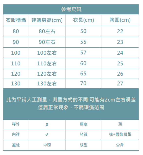 例如:身高115cm偏瘦沒有小肚子,可直接挑選110碼。