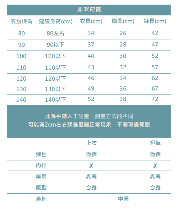 ▌內容物:短袖上衣+長褲