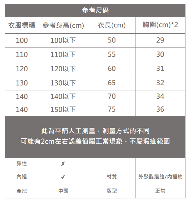 下單前務必參考尺碼表上建議身高