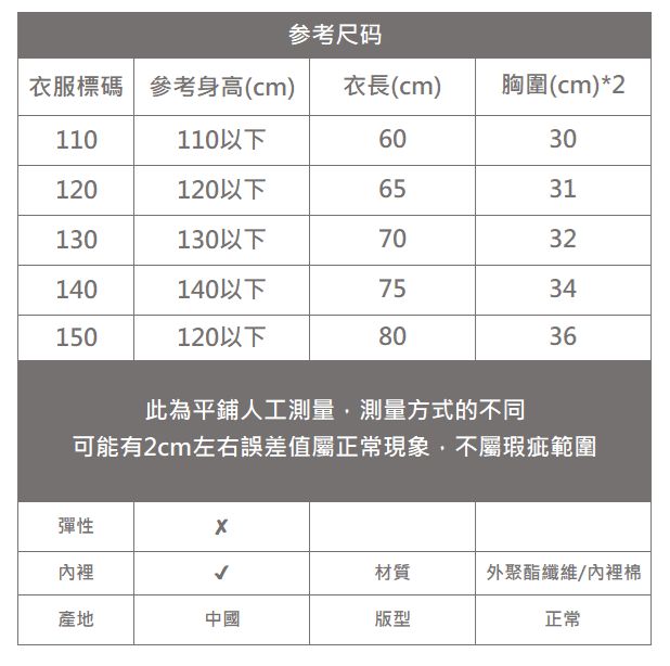 下單前務必參考尺碼表上建議身高