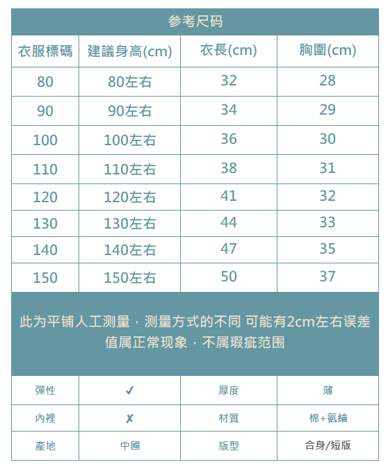 下單前務必參考尺碼表上建議身高