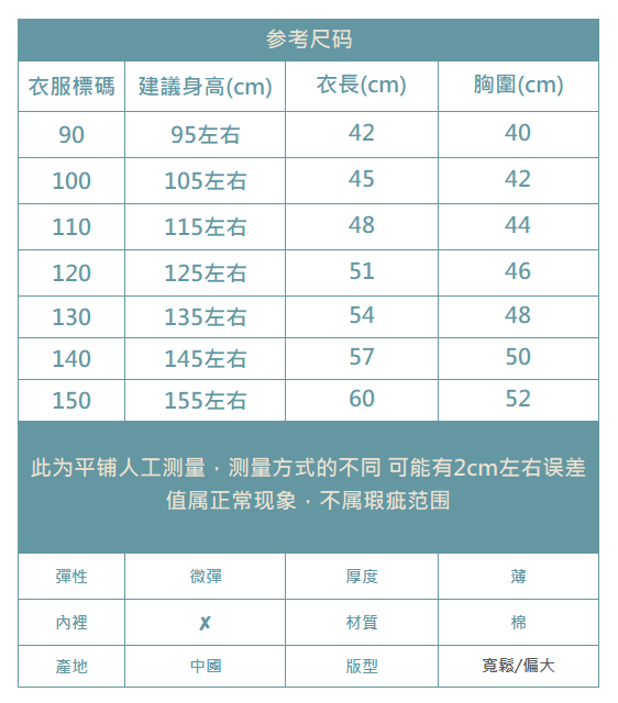 下單前務必參考尺碼表上建議身高