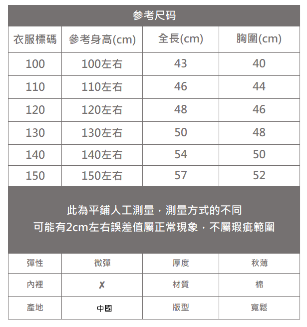 下單前務必參考尺碼表上建議身高