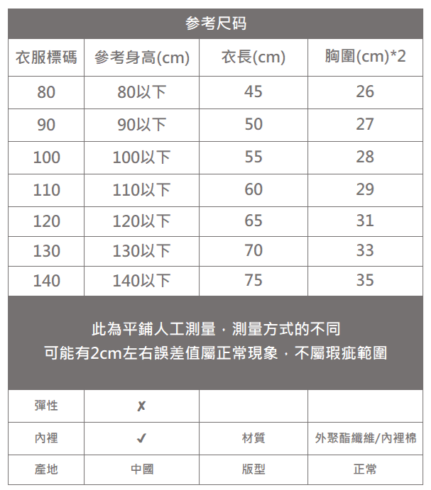 下單前務必參考尺碼表上建議身高