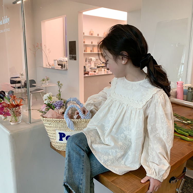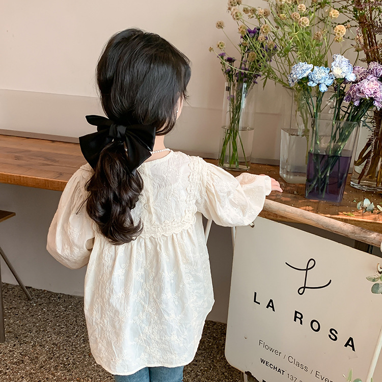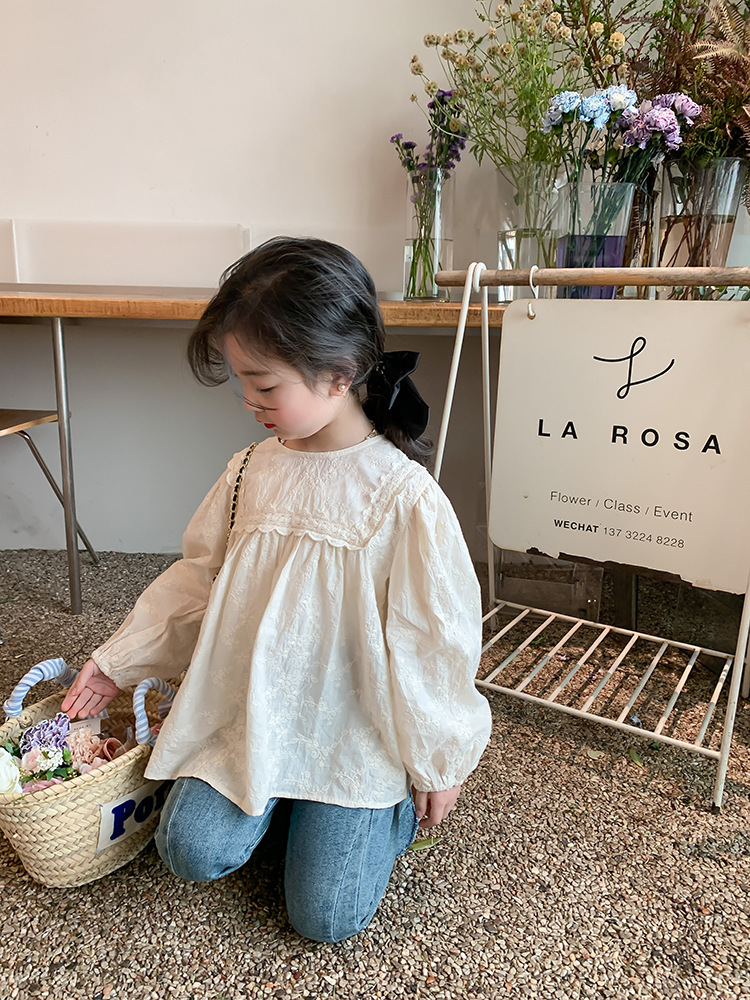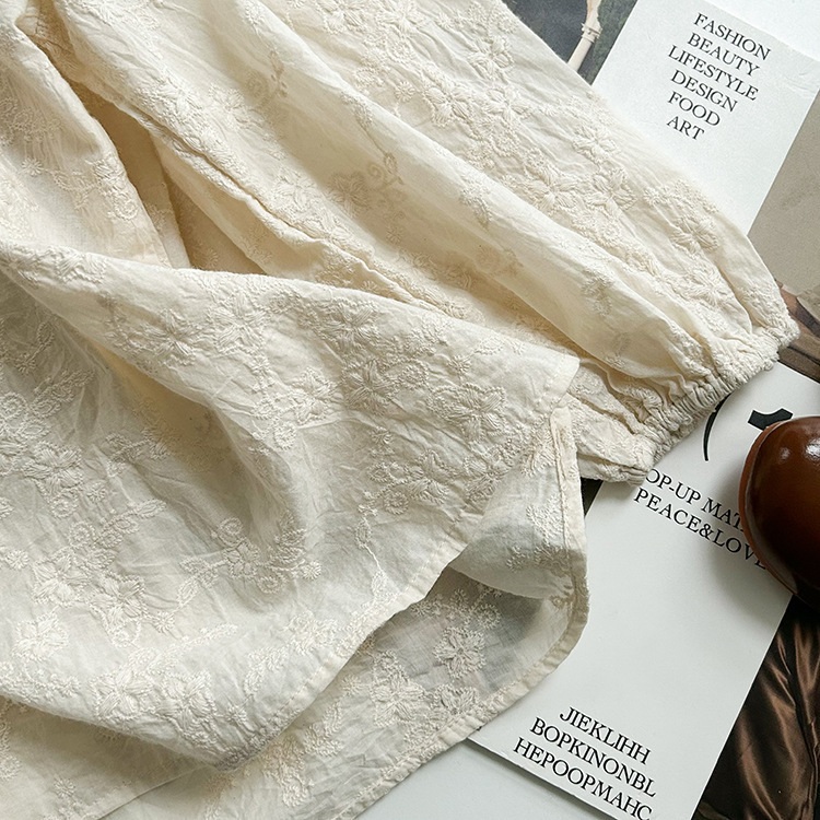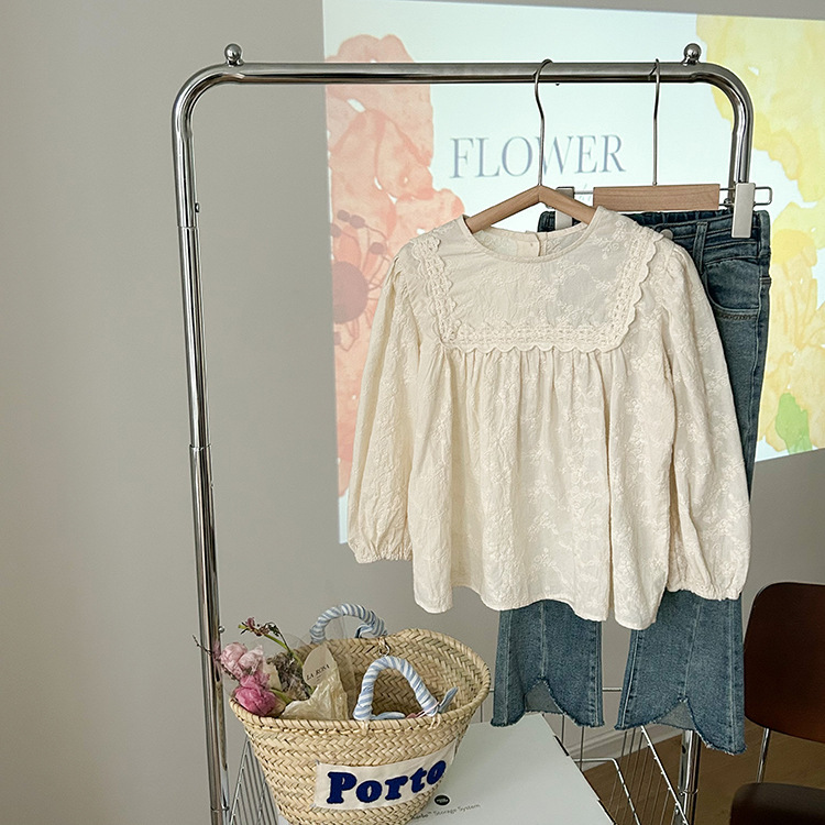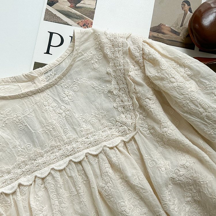【限量】米色刺繡緹花-春秋長袖上衣 (80-150)