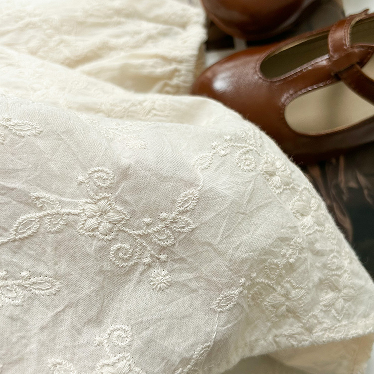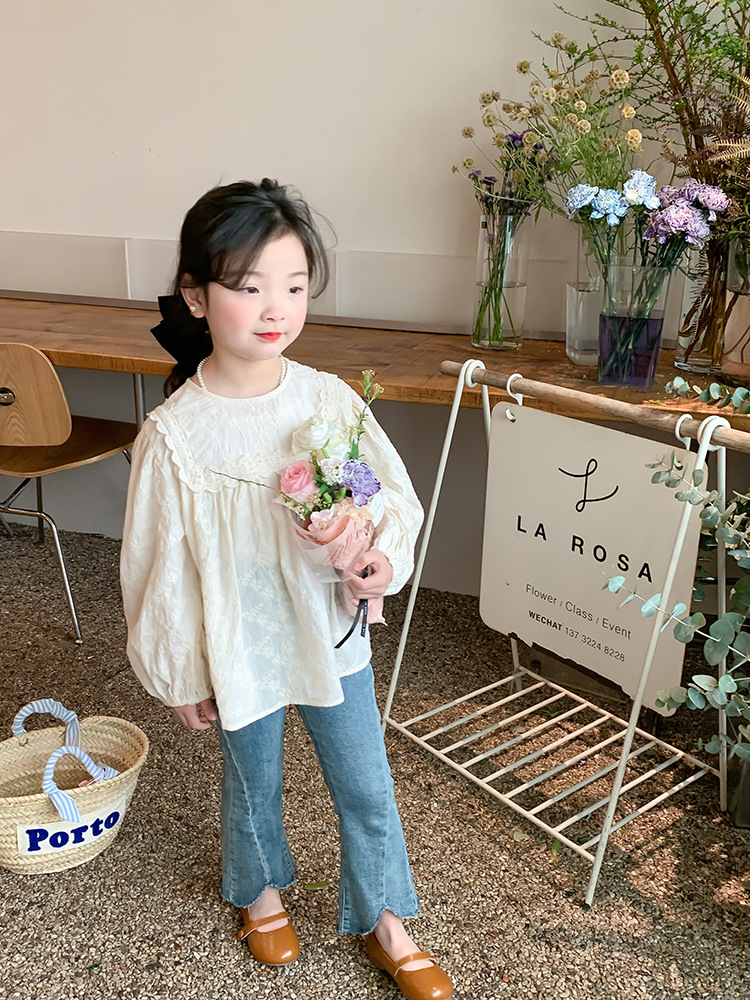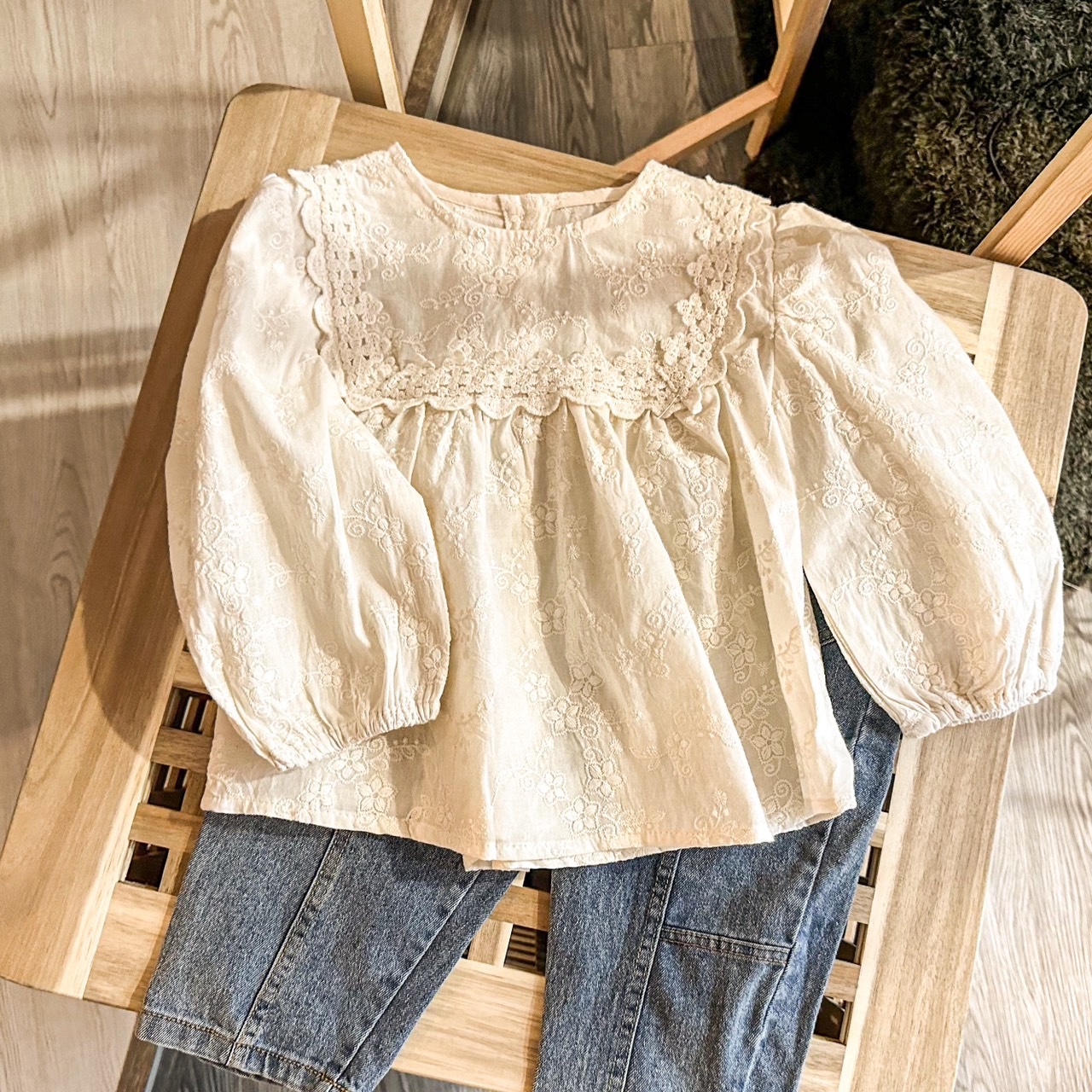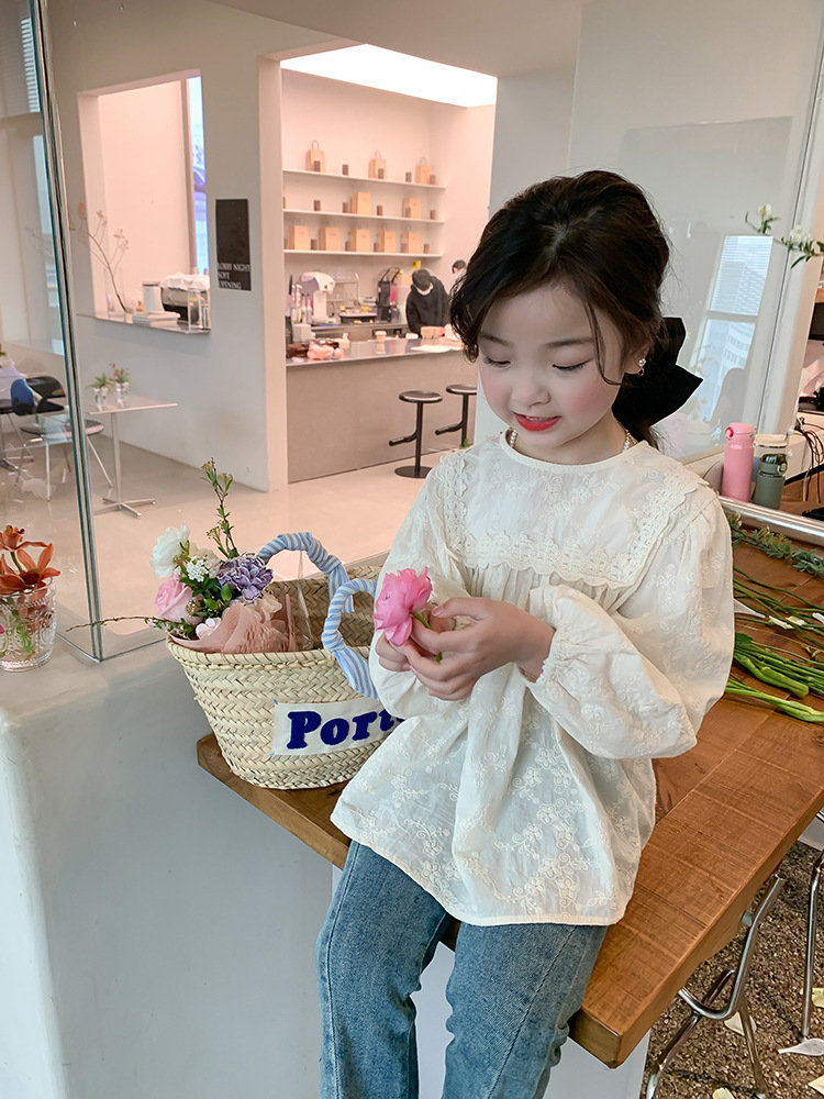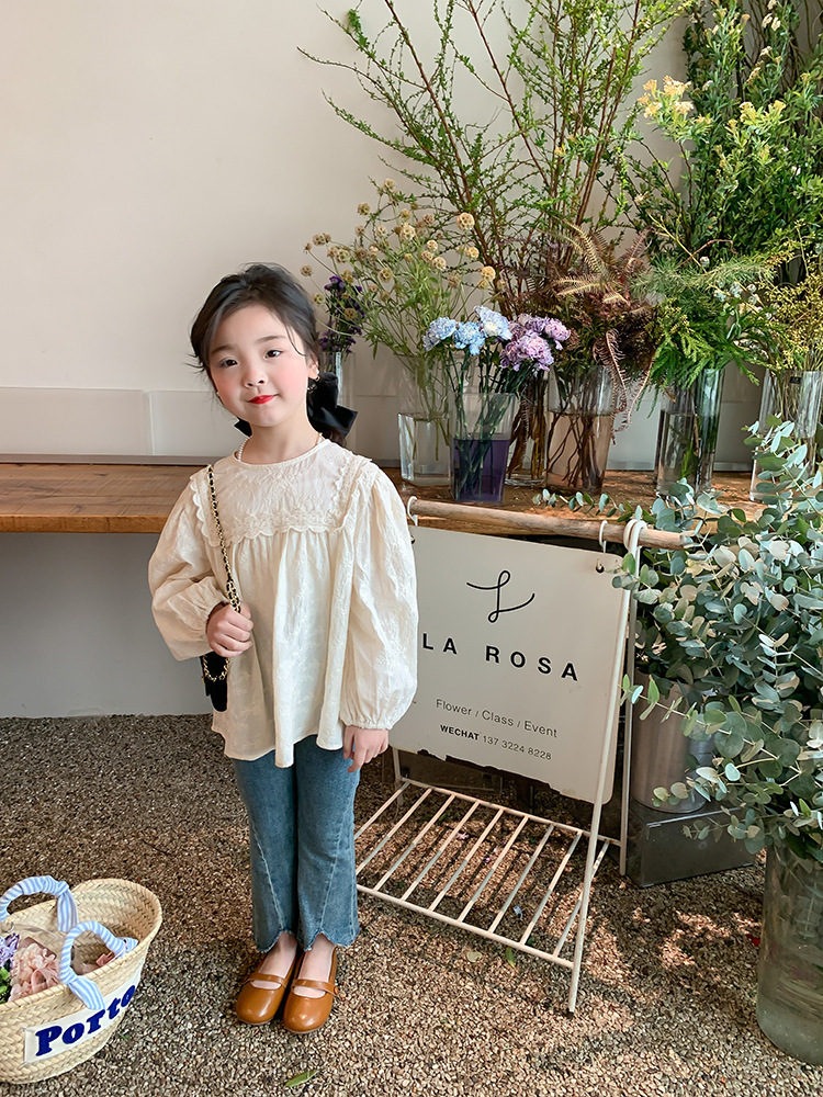 【限量】米色刺繡緹花-春秋長袖上衣 (80-150)