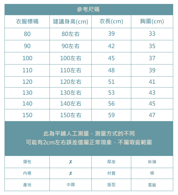 下單前務必參考尺碼表上建議身高