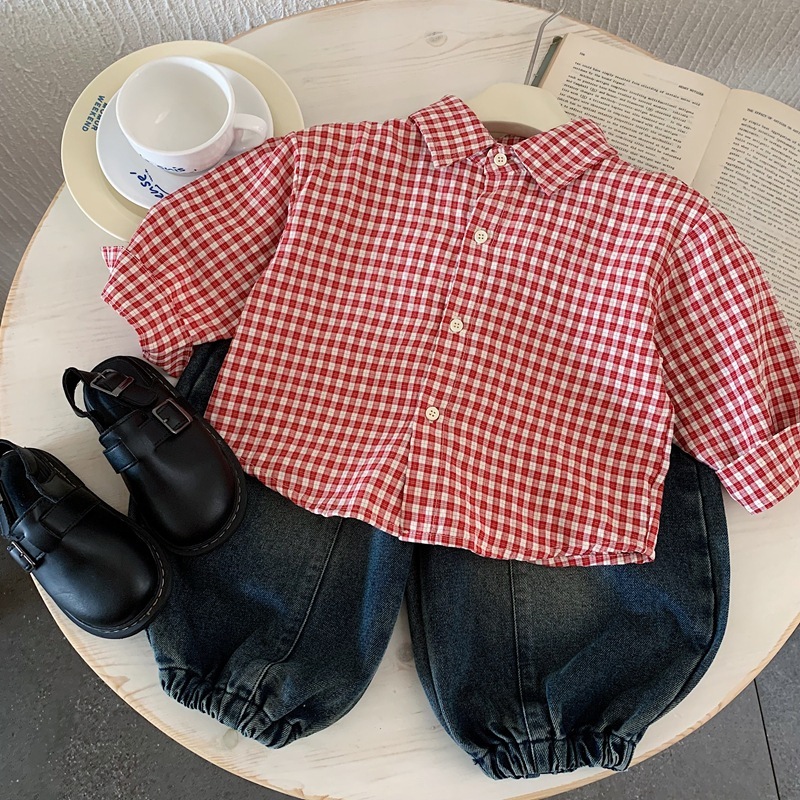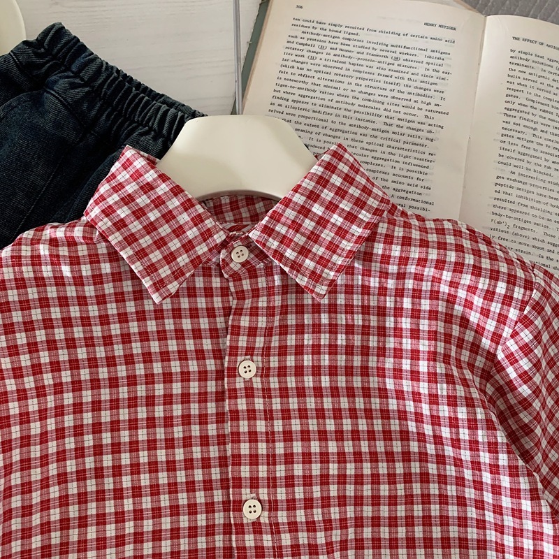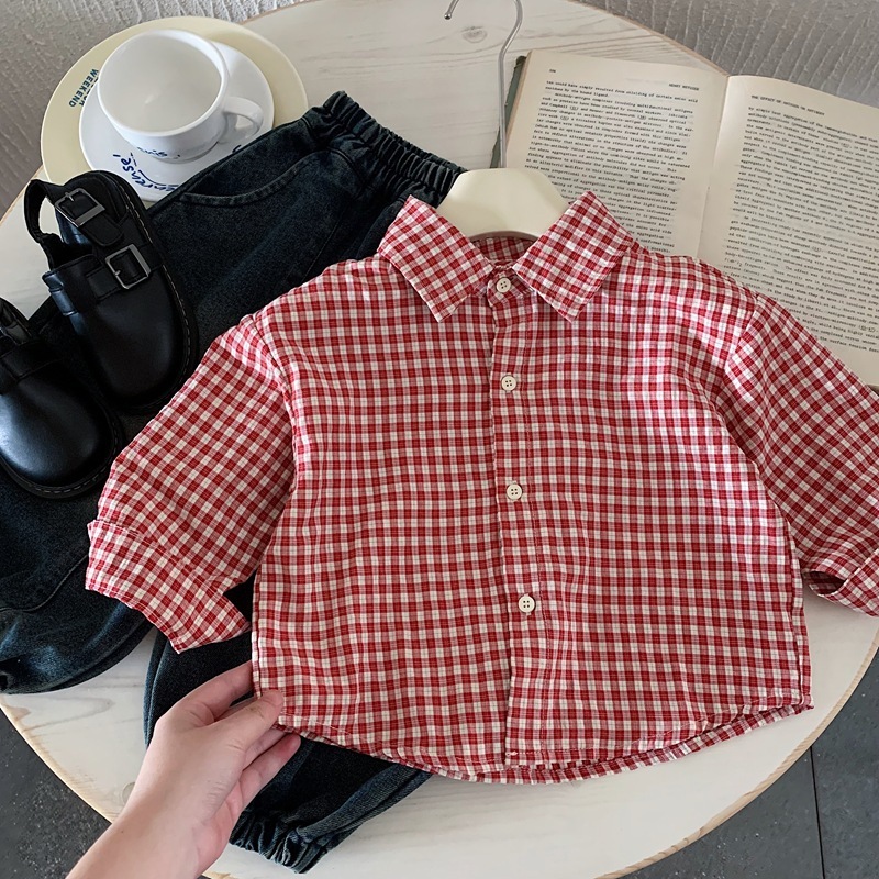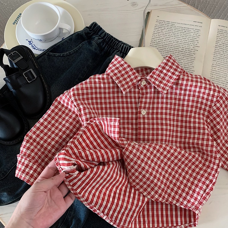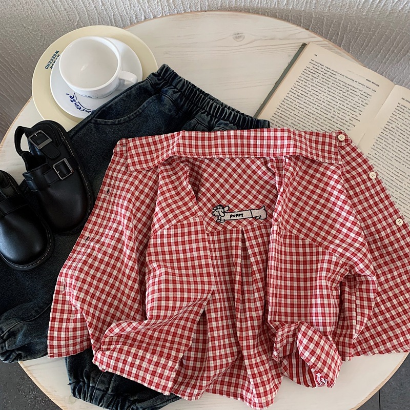 紅色格子 長袖上衣/襯衫