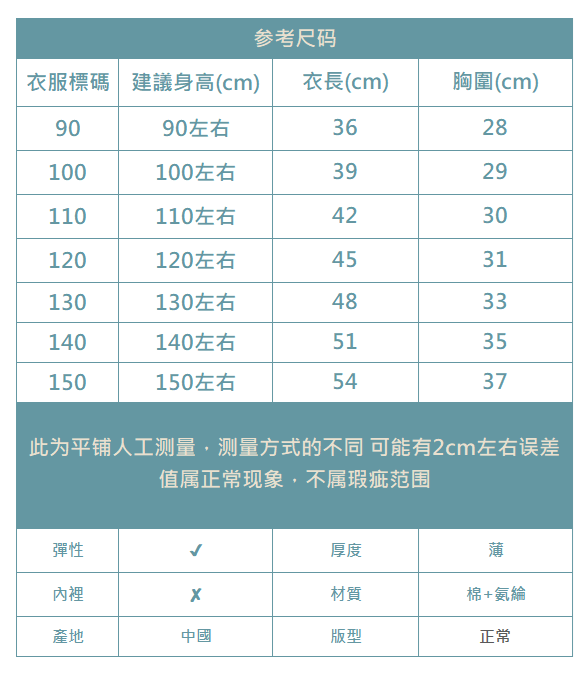 下單前務必參考尺碼表上建議身高