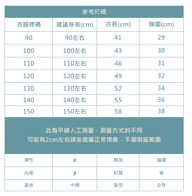 下單前務必參考尺碼表上建議身高
