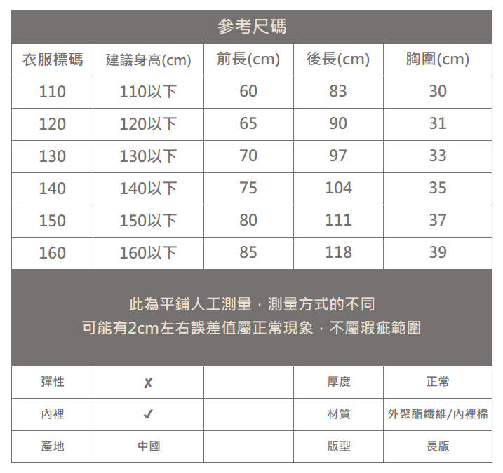 下單前務必參考尺碼表上建議身高