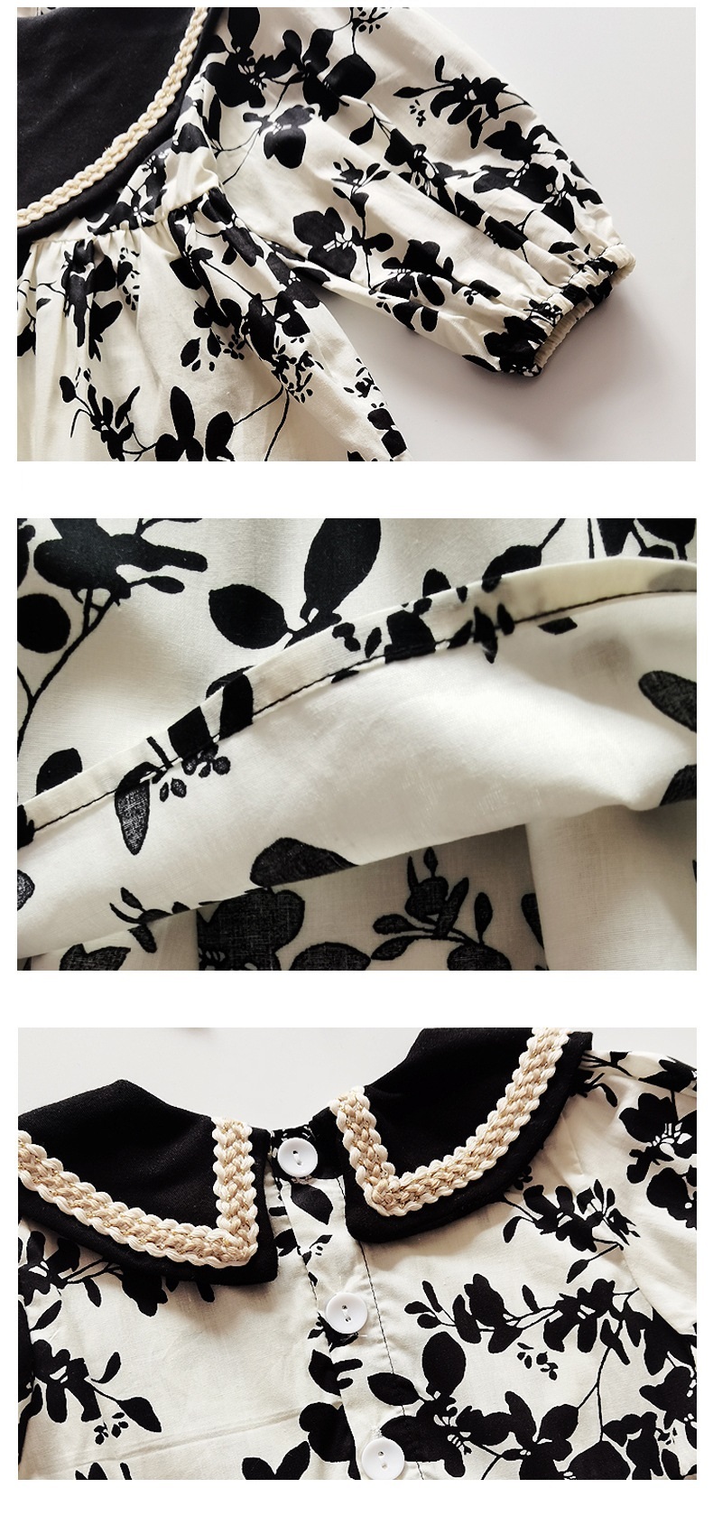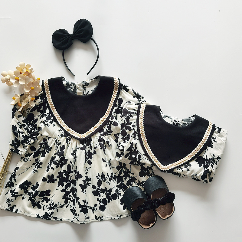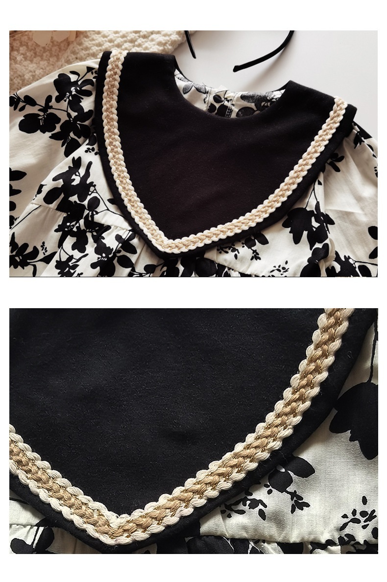 -限量-[ 送髮帶 ] 米黑大V花花-春秋長袖純棉包屁衣/洋裝(66-90)